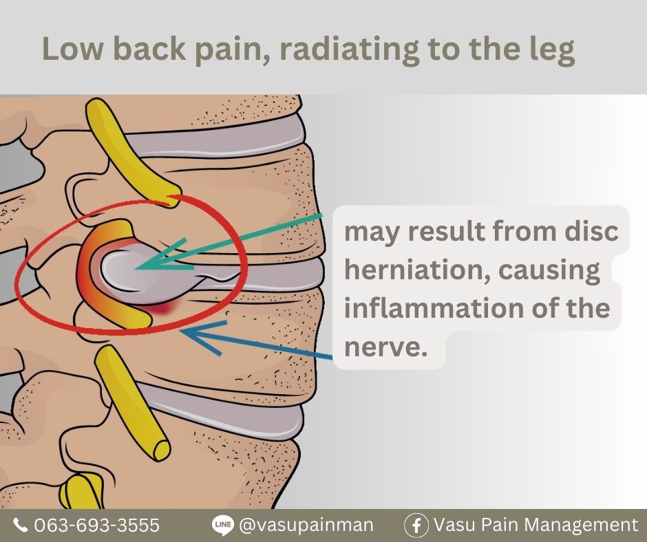 Symptoms of lower back pain radiating to the leg may result from disc herniation, which cause inflammation of the nerve. This leads to pain traveling down the leg along the path of the affected nerves. Generally, it's not a severe condition unless there are signs of weakness or difficulty controlling urination or defecation. However, the pain can be disruptive to daily life.