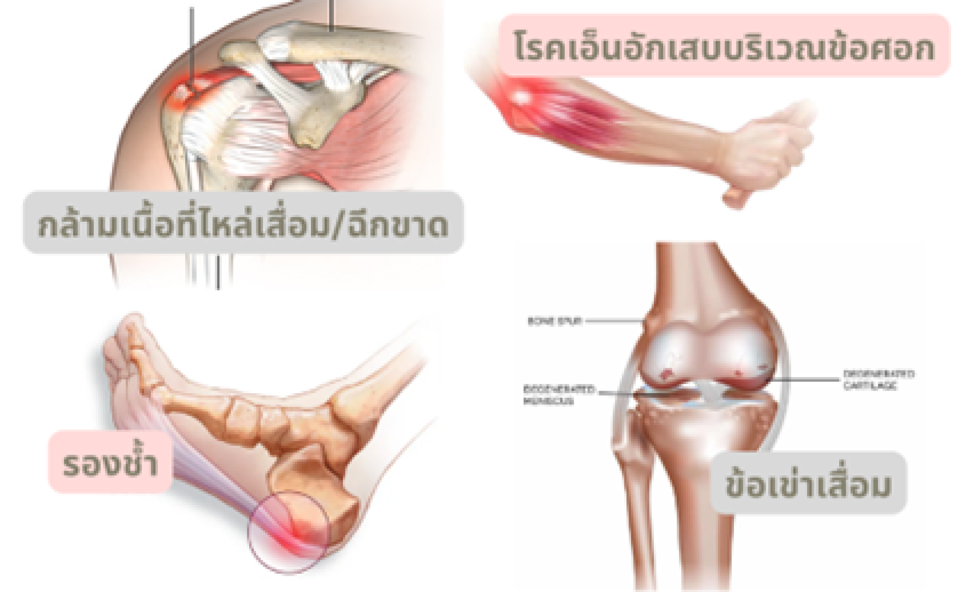 Injuries to various organs, such as torn or degenerated tendons in the shoulder, Plantar fasciitis, Achilles tendinitis.