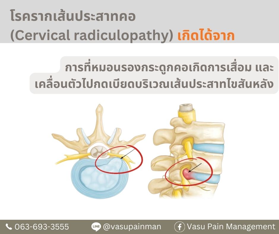 โรครากเส้นประสาทคอ (Cervical radiculopathy) เกิดได้จาก การที่หมอนรองกระดูกคอเกิดการเสื่อม และเคลื่อนตัวไปกดเบียดบริเวณเส้นประสาทไขสันหลัง