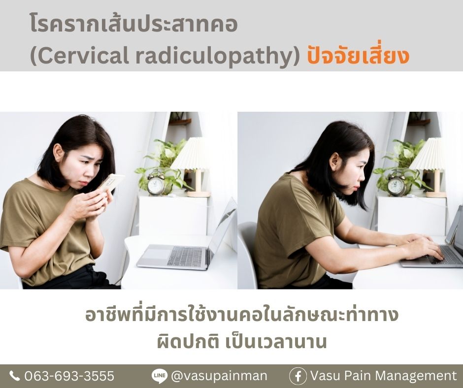 ปัจจัยเสี่ยงของโรครากเส้นประสาท คือ การที่นั่งใช้งานคอในลักษณะท่าทางที่ผิดปกติเป็นเวลานาน เช่น การที่ส่วนของคอยื่นไปข้างหน้ามากกว่าปกติ ซึ่งจะพบได้บ่อยในกลุ่มคนที่มีภาวะออฟฟิศซินโดรมที่มีอาการปวดคอเรื้อรัง