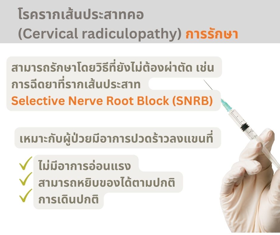 สามารถรักษาได้ โดยการผ่าตัดและไม่ผ่าตัด โดยที่ Vasu Pain Management จะมีวิธีรักษาโดยไม่ต้องผ่าตัด คือ การฉีดยาลดการอักเสบไปที่รากเส้นประสาท หรือ Selective Nerve Root Block (SNRB) ซึ่งการรักษาดังกล่าวจะเหมาะกับผู้ที่ปวดร้าวลงแขนที่ ไม่มีอาการอ่อนแรง ยังสามารถหยิบของได้ตามปกติ การเดินปกติ