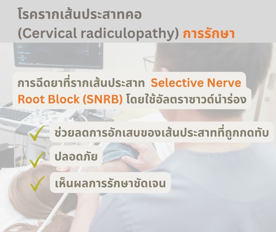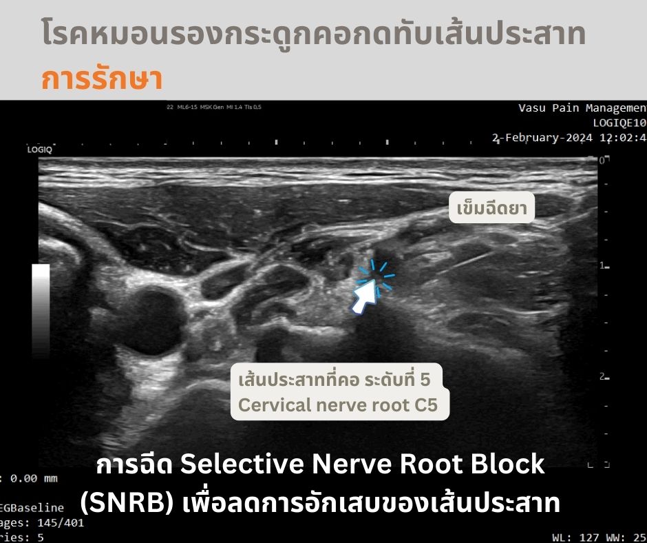 จากรูป เป็นการฉีดยาที่รากของเส้นประสาท Selective Nerve Root Block (SNRB) ที่เส้นประสาทคอระดับที่ 5