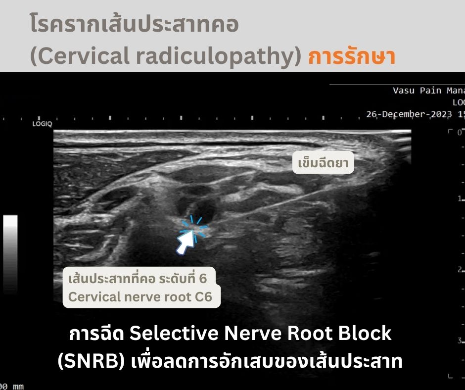 จากรูป เป็นการฉีดยาที่รากของเส้นประสาท Selective Nerve Root Block (SNRB) ที่เส้นประสาทคอ ระดับที่ 6