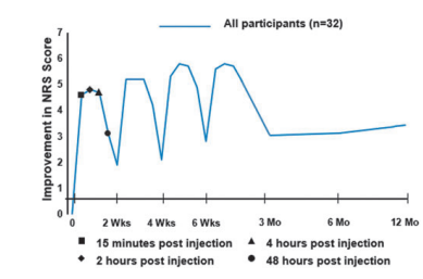 และในปี 2018 Liza และคณะ 2 ทำการฉีดสารละลายกลูโคสเข้าไปที่โพรงไขสันหลังต่อเนื่อง ทุก 2 สัปดาห์ นาน 4 ครั้ง พบว่าทุกๆครั้งที่ได้รับการฉีดสารละลายกลูโคส อาการปวดจะลดลงเรื่อย ๆ จากคะแนนความปวดเริ่มต้นที่ 6.5 จะลดลงเหลือ ประมาณ 3 คะแนนที่1 ปี และผู้ที่ได้รับการฉีดสารละลายกลูโคส 21 คนจาก32 คน (66%) มีอาการปวดลดลงมากกว่า 50%